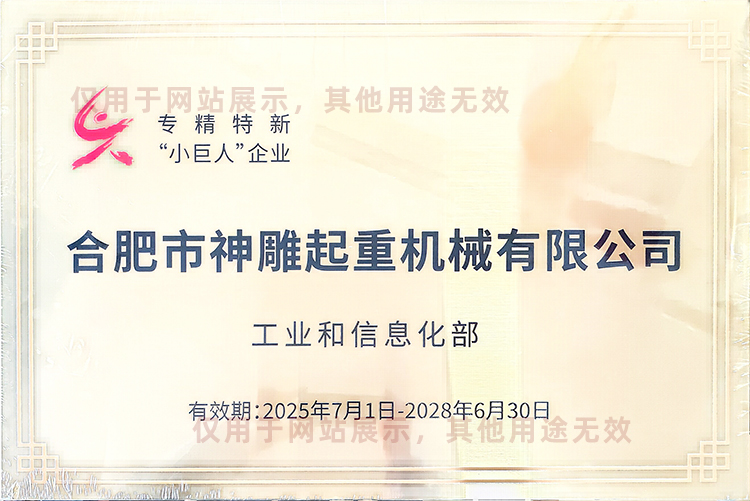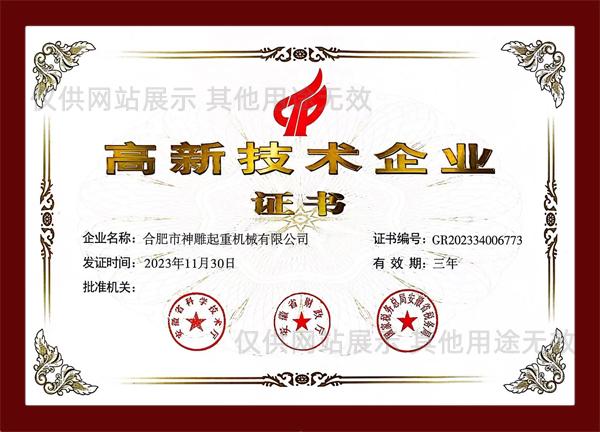 合肥神雕起重是高新技術(shù)企業(yè),是安徽省科創(chuàng)板掛牌企業(yè)(證券代碼:630331),同時(shí)榮獲安徽市場(chǎng)質(zhì)量、誠(chéng)信五星級(jí)企業(yè)、合肥經(jīng)濟(jì)圈示范企業(yè)、合肥市創(chuàng)新型企業(yè)、安徽省市場(chǎng)質(zhì)量放心產(chǎn)品等榮譽(yù)稱號(hào)